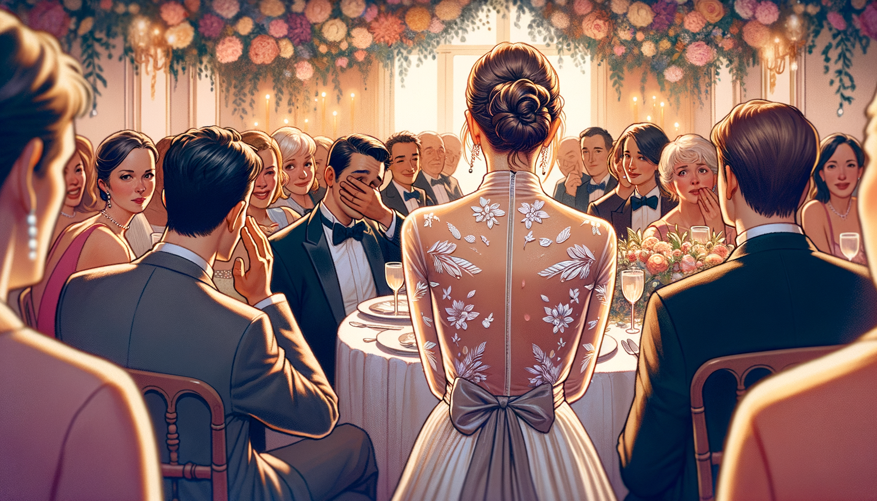最初は笑いに包まれた会話でしたが、突然の静けさが訪れました。美咲の話した過去の恋愛エピソードが、偶然にも新婦の過去と重なる部分があったのです。その瞬間、友人たちの笑い声はピタリと止まり、困惑した表情が広がりました。誰もがどう反応すべきか分からず、場は凍りついたのでした。